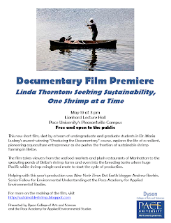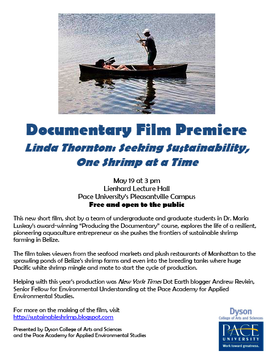 (May 16, 2011) “In a new documentary, "Linda Thornton: Seeking Sustainability, One Shrimp at a Time," a team of Pace University student filmmakers explore the life of a resilient, pioneering aquaculture entrepreneur as she pushes the frontiers of ... and graduate students in Dr. Maria Luskay's award-winning "Producing the Documentary" course, explores the life of a resilient, pioneering aquaculture entrepreneur as she pushes the frontiers of sustainable shrimp farming in Belize….”
